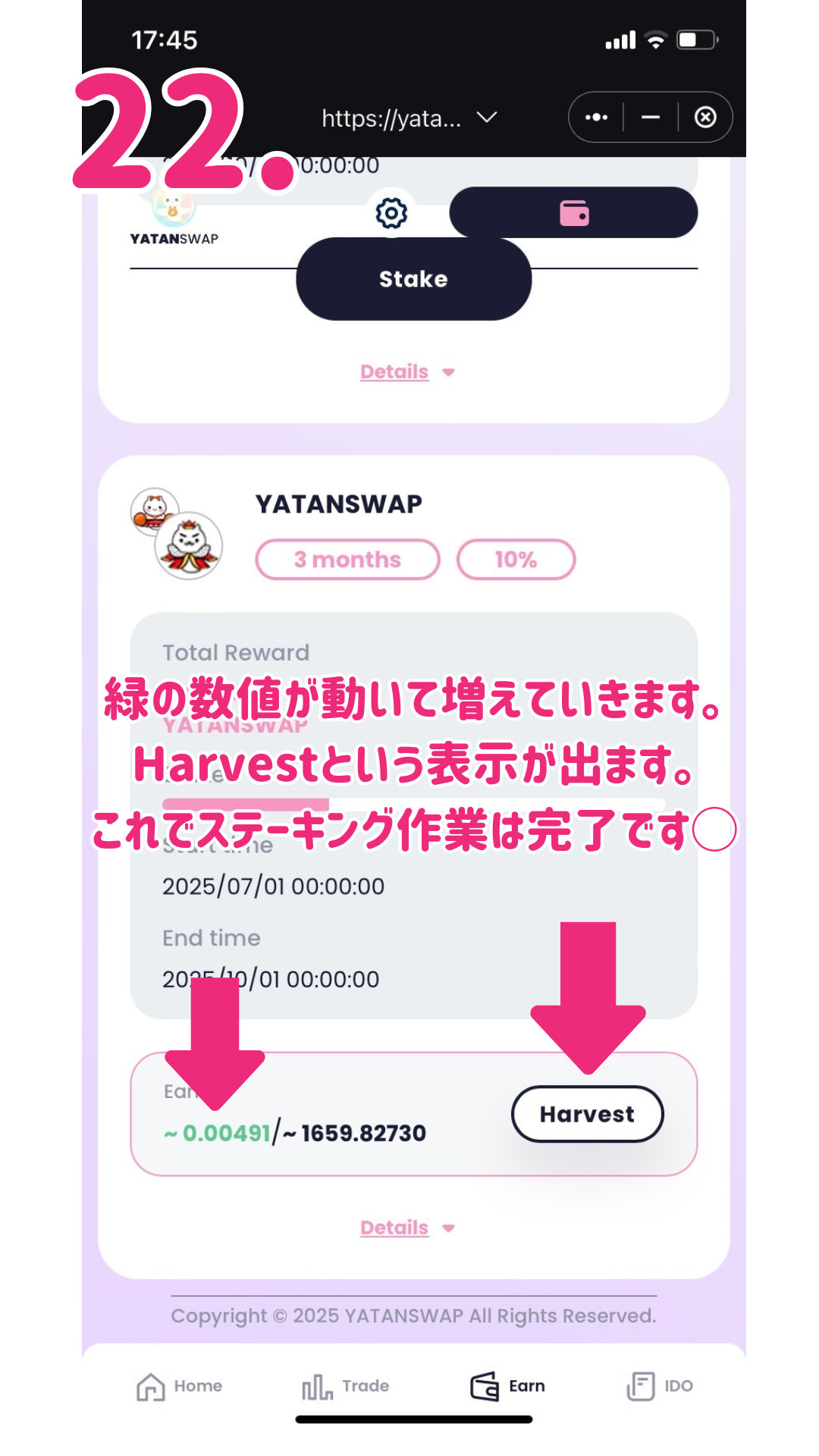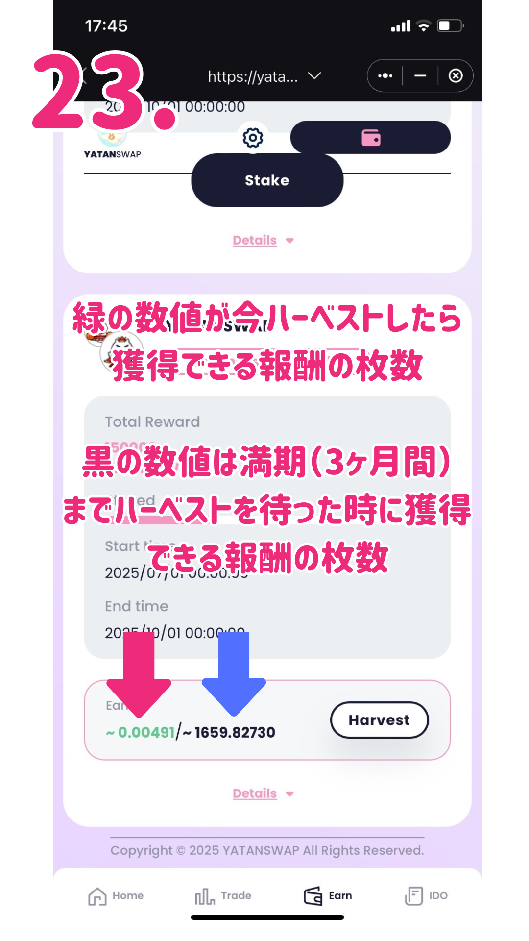 23.赤色の矢印の指す緑の数値が今ハーベストしたら獲得できる報酬の枚数、青色の矢印の指す黒の数値は満期(3ヶ月間)までハーベストを待った時に獲得できる報酬の枚数です。覚えておきましょう。