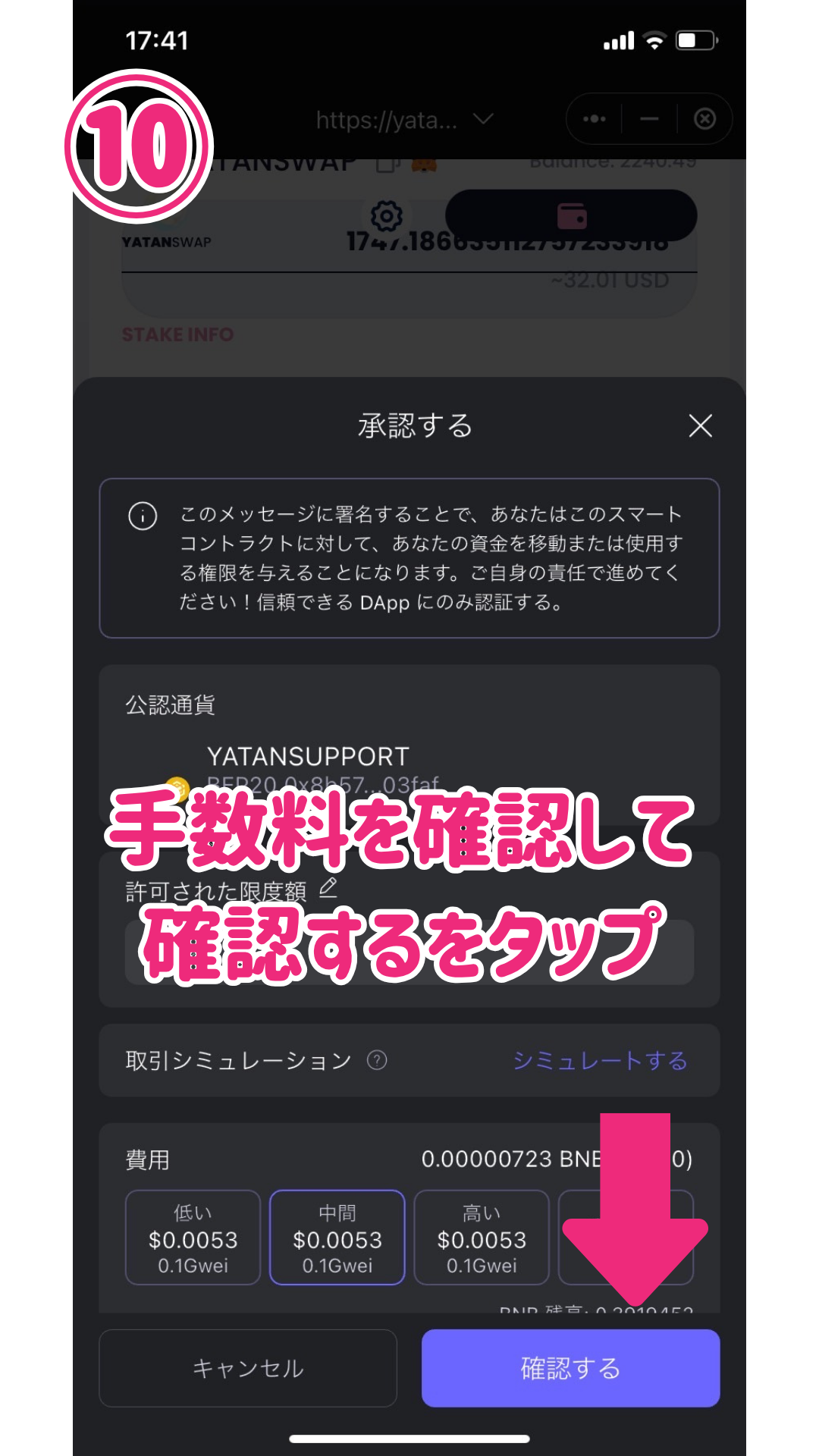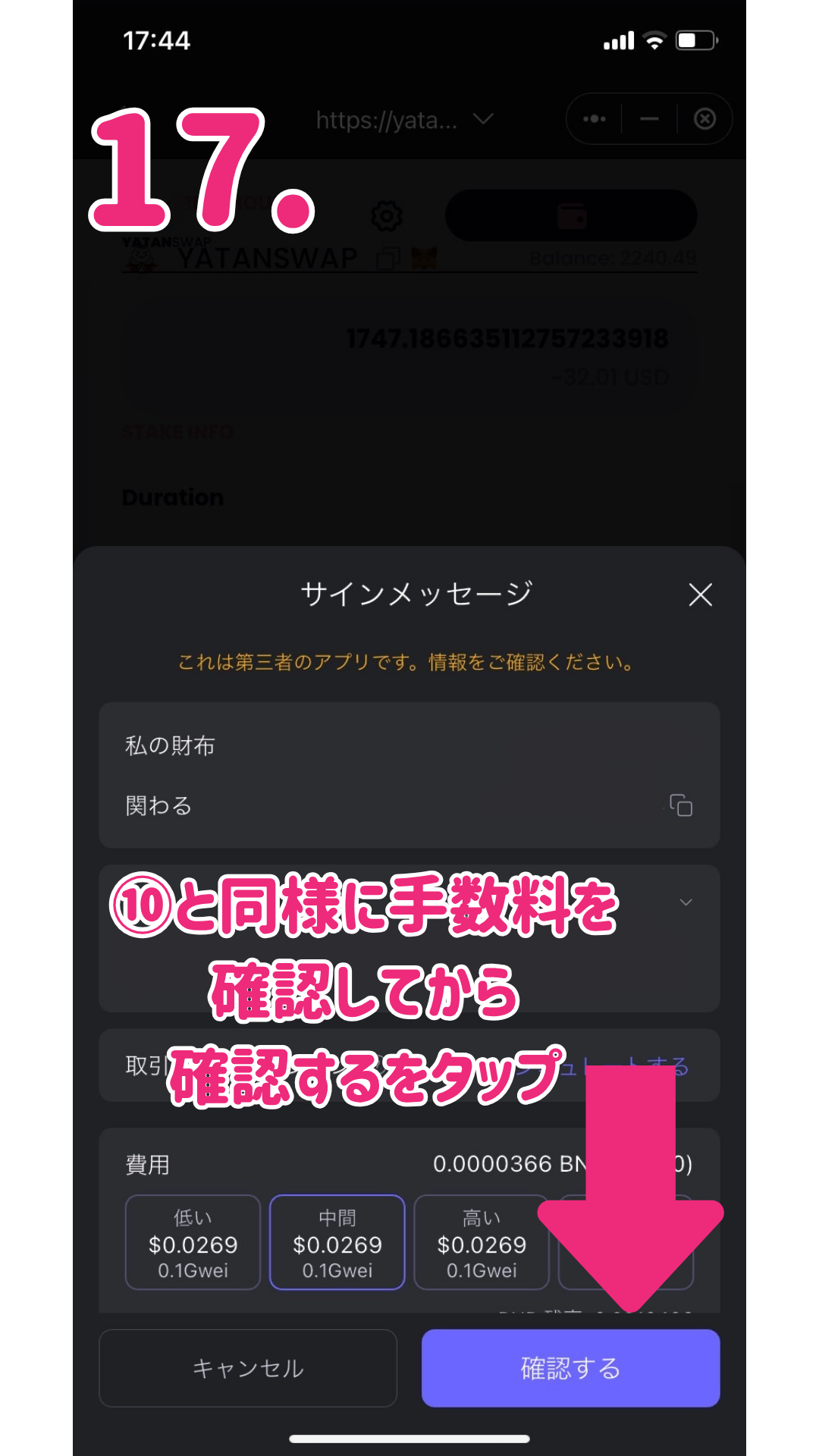 17.⑩と同様に手数料の確認をしてから確認するをタップします。