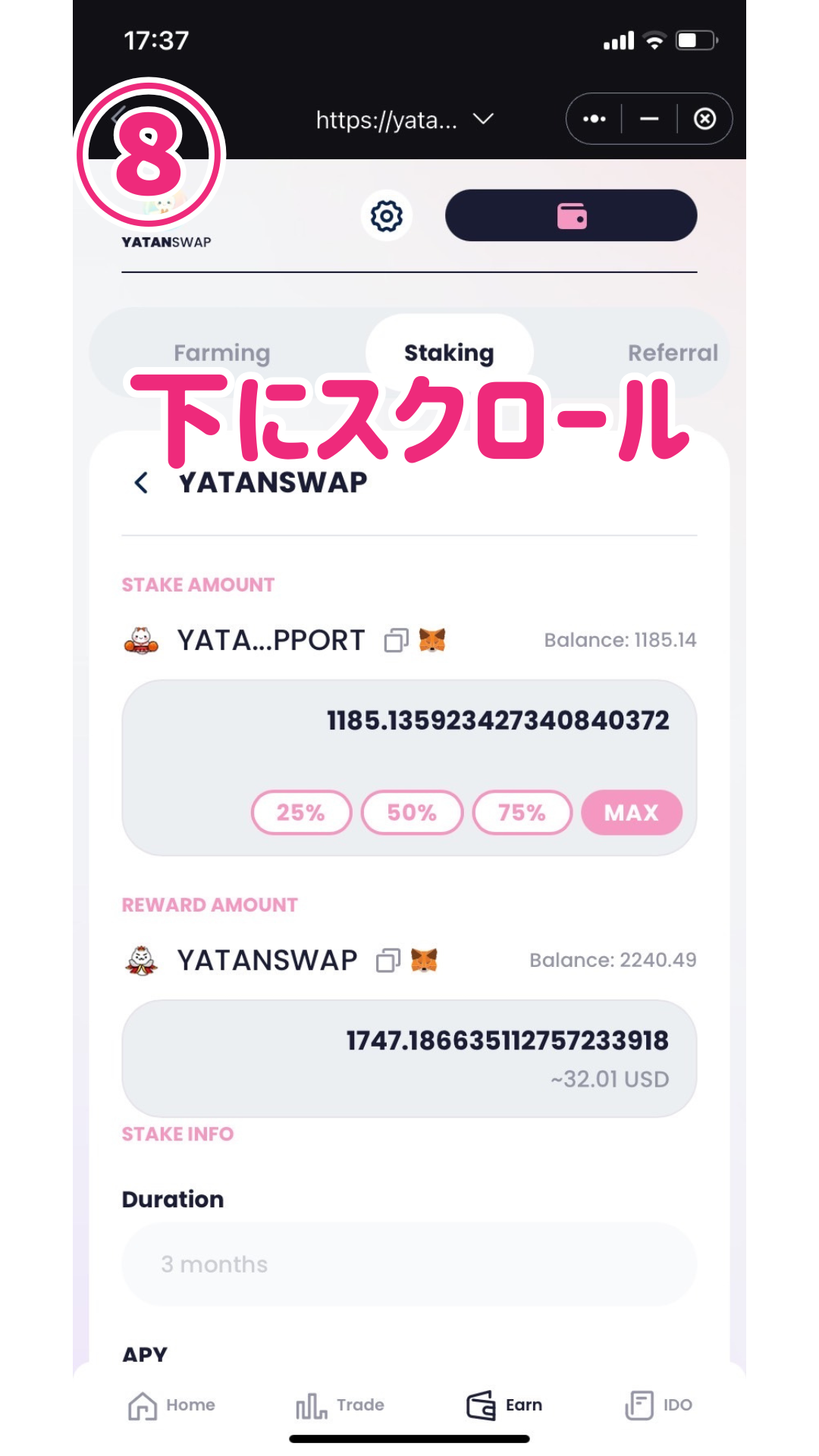 ⑤下にスクロールしてやりたいステーキングの所に行きます。今回はYATAN SUPPORTを預けてYATANSWAPを報酬として得るステーキングをしてみます。