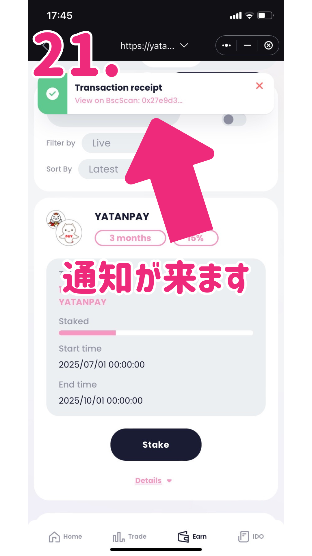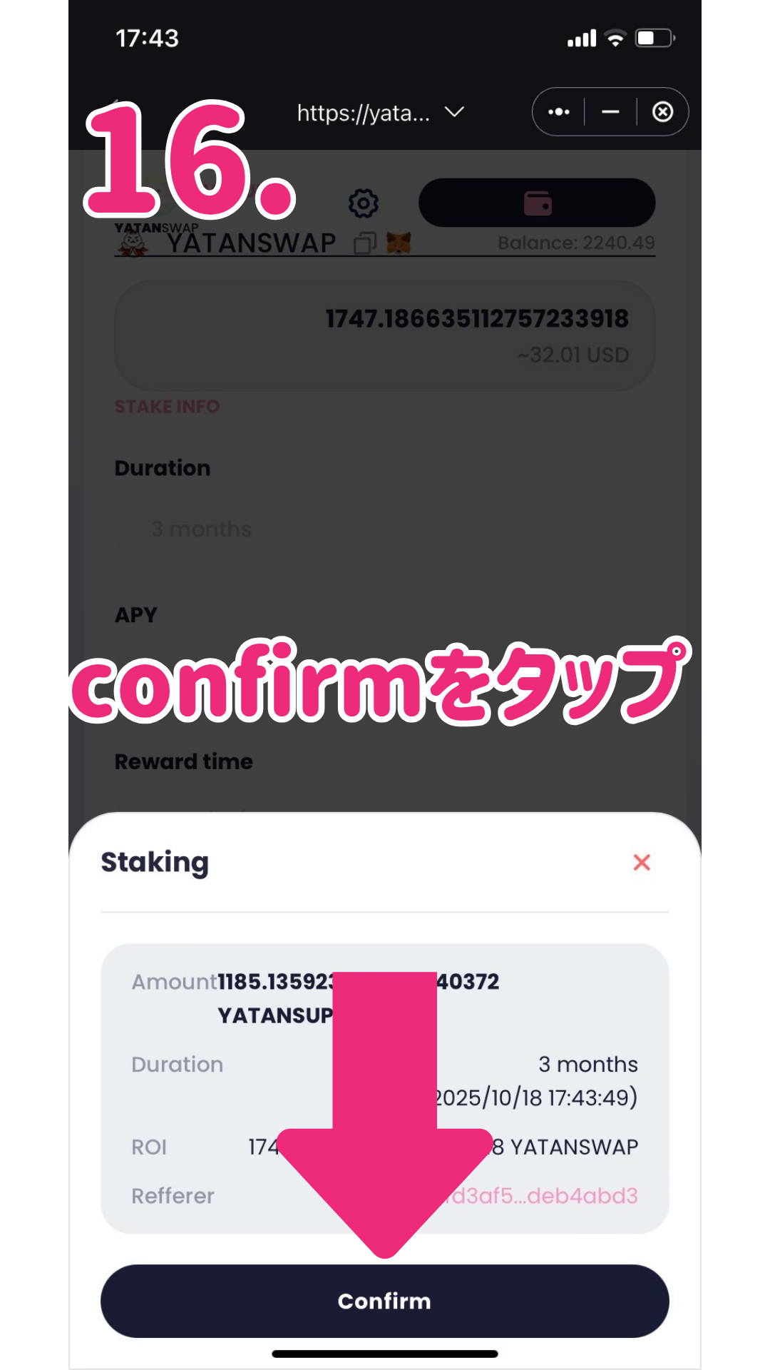 今持っていてステーキングが出来るYATANSUPPORTを全部このステーキングの運用に回したい場合はMAXをタップすればOKです。画像ではMAXをタップしています。