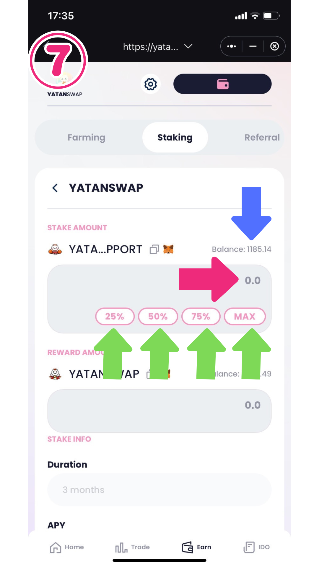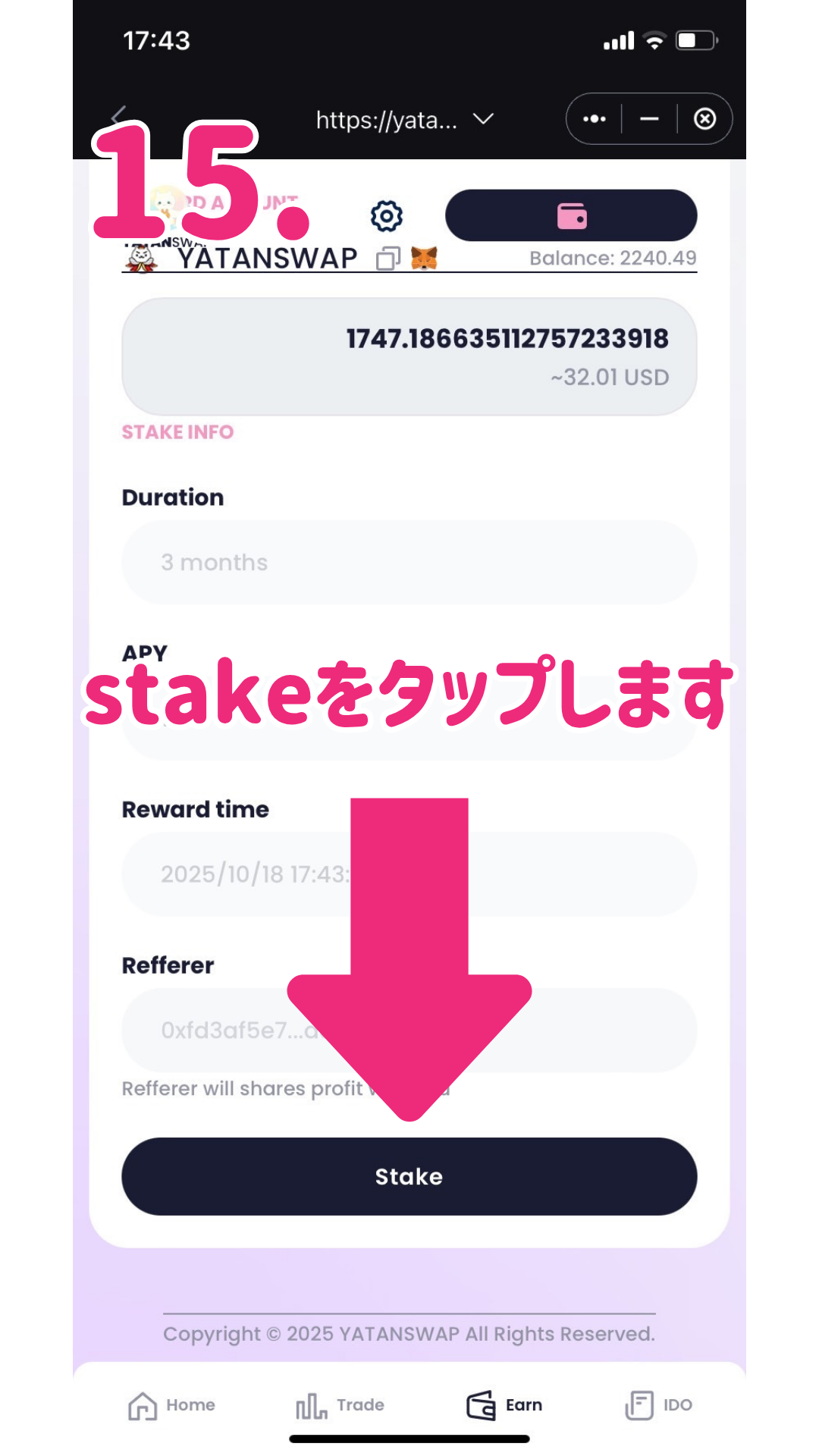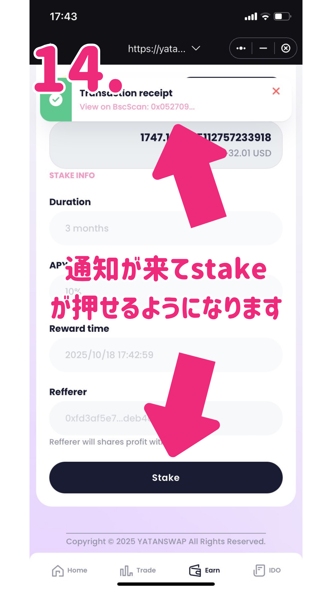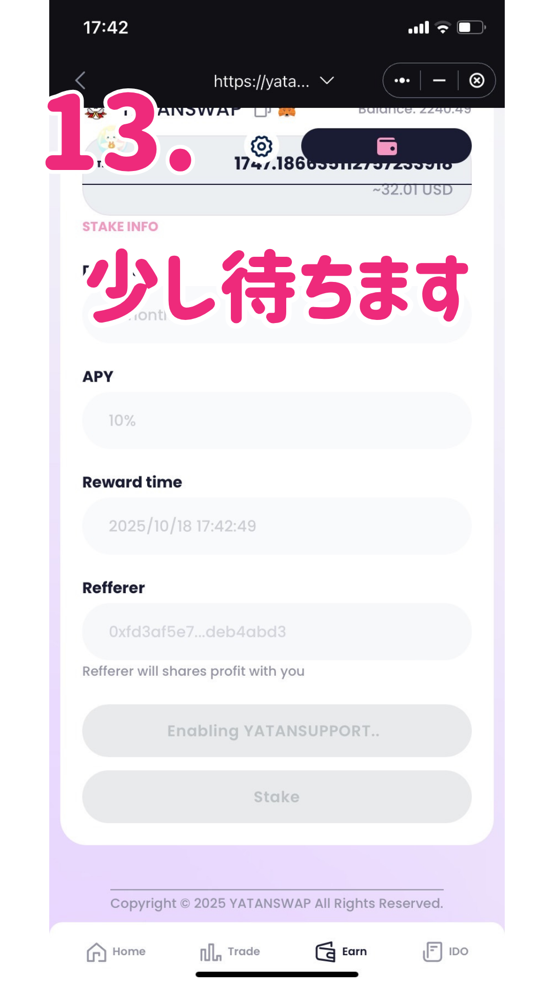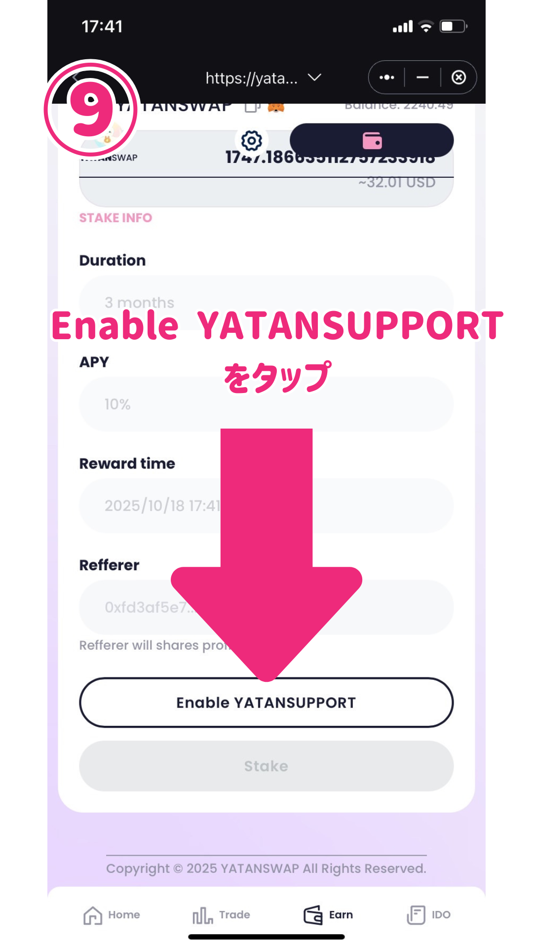 青矢印の所のBalanceの横にある数値が今現在持っているステーキング出来るYATANSUPPORTの量です。