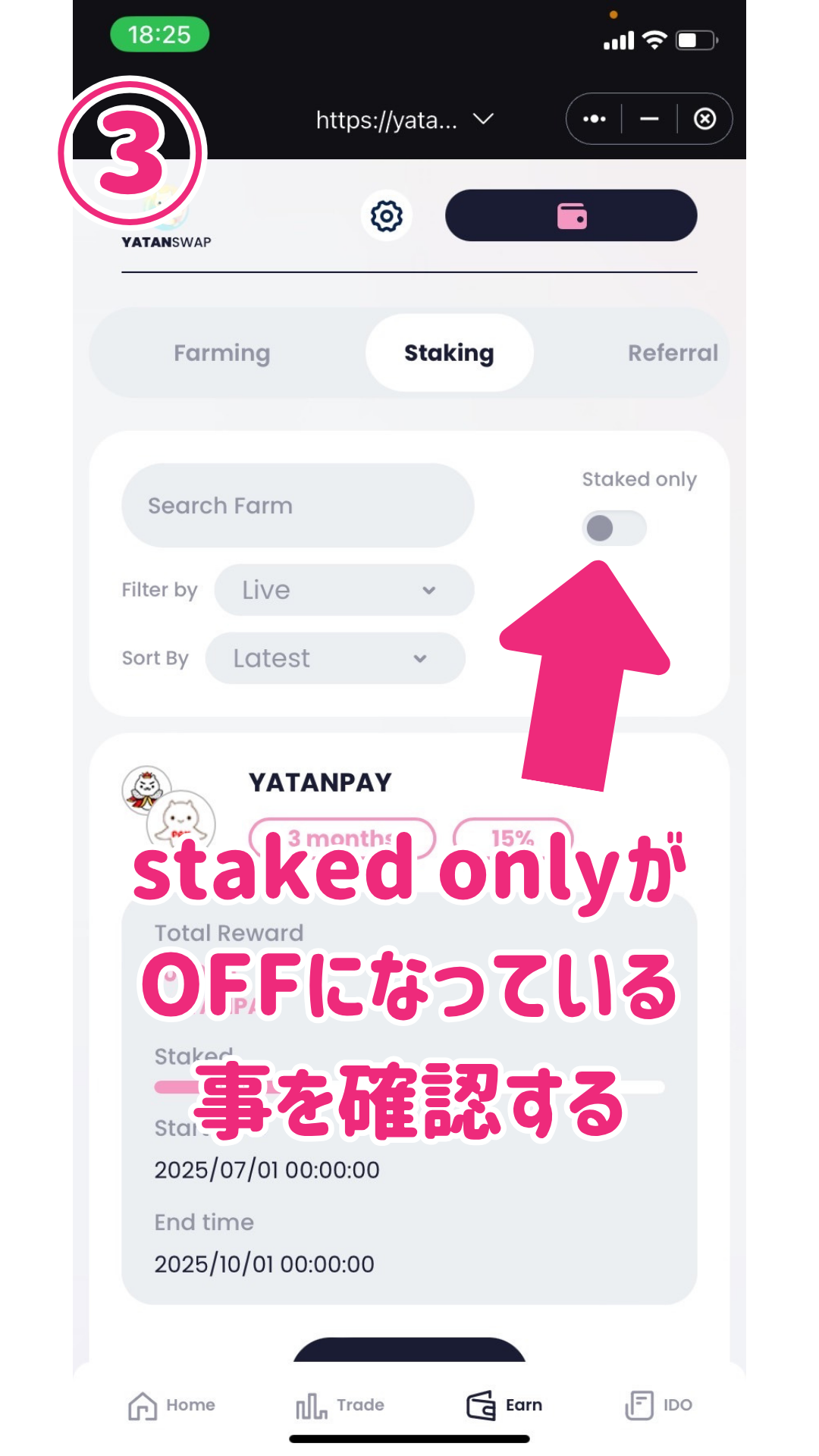 ③staked onlyがOFFになっている事を確認します。(③の画像はOFFの状態です。)