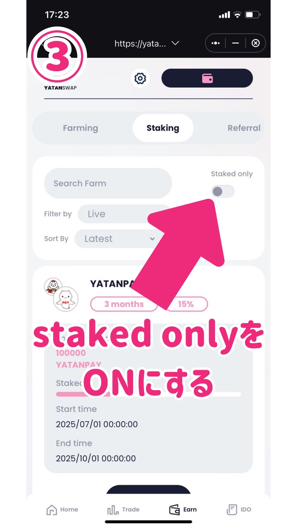 ③staked onlyをONにします。(③の画像はOFFの状態です。)