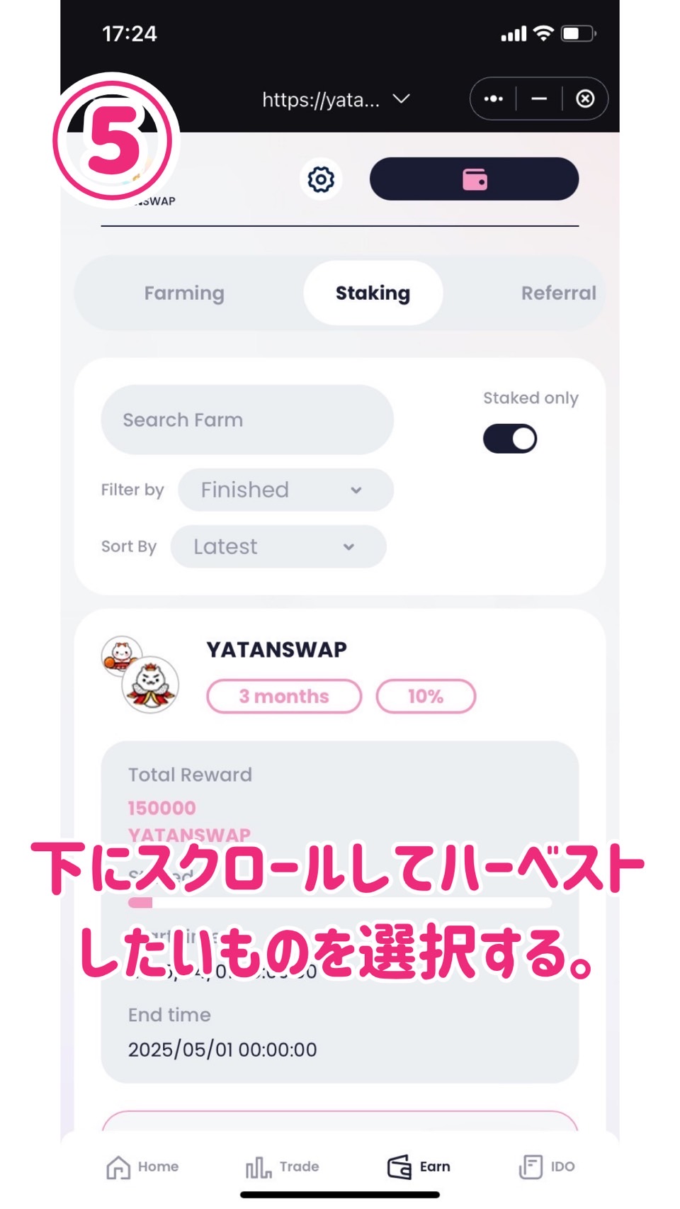 ⑤自分の現在ステーキングしているデータが下に表示されるので下にスクロールして自分がハーベストしたいステーキングの所に行きます。