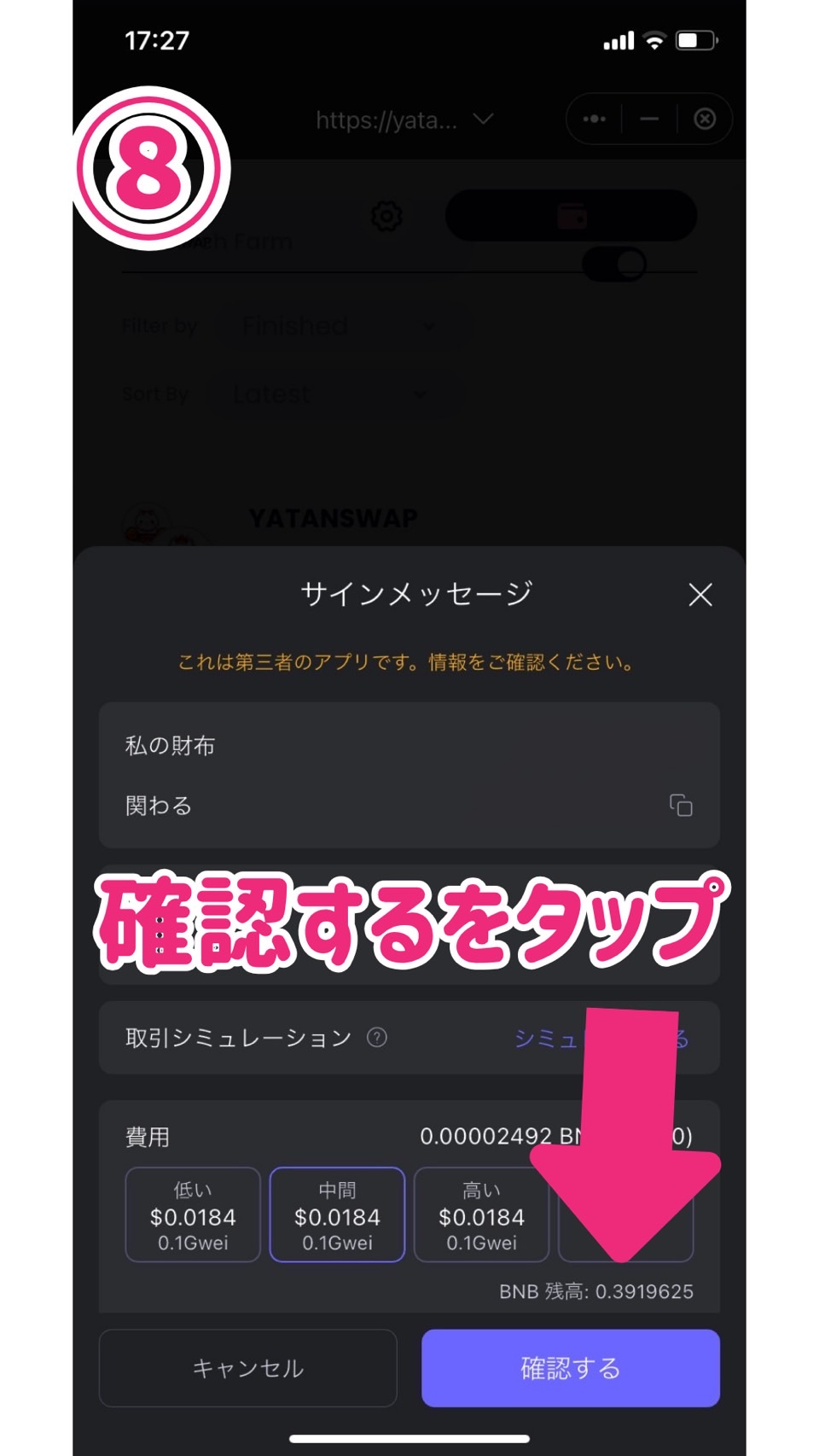⑧手数料を確認してから確認するをタップします。