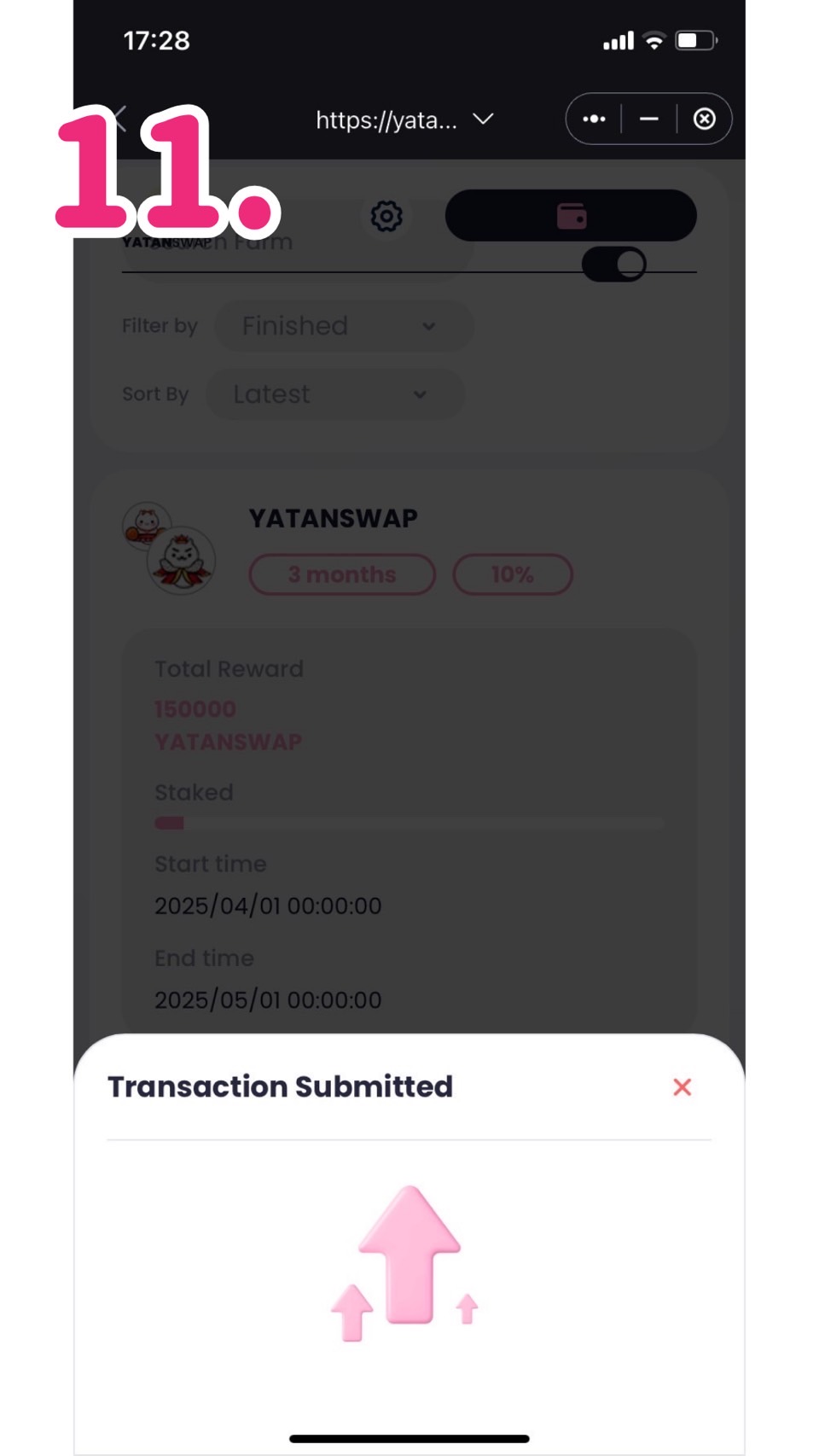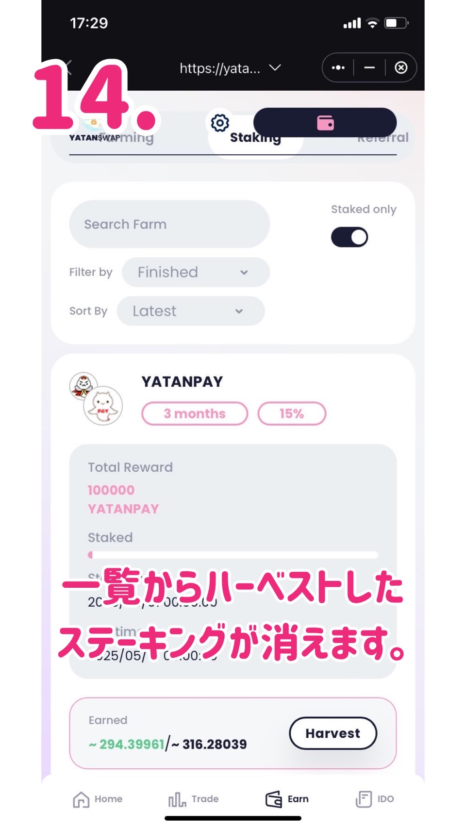 14.staked onlyの状態になっているので今、ハーベストしたYATANSUPPORTを預けてYATAN SWAPを得るステーキングが一覧から消えています。これでハーベストは完了です。