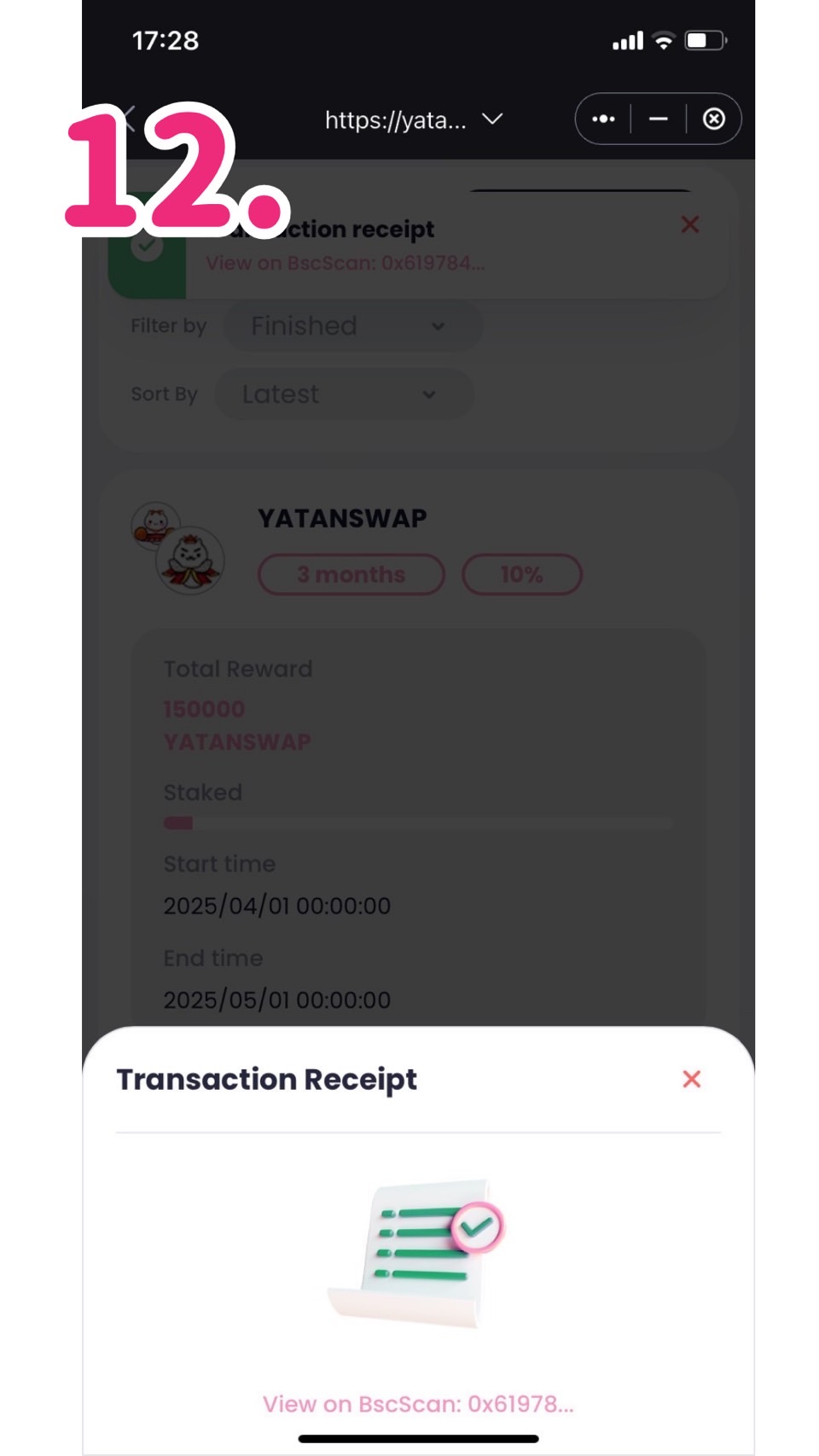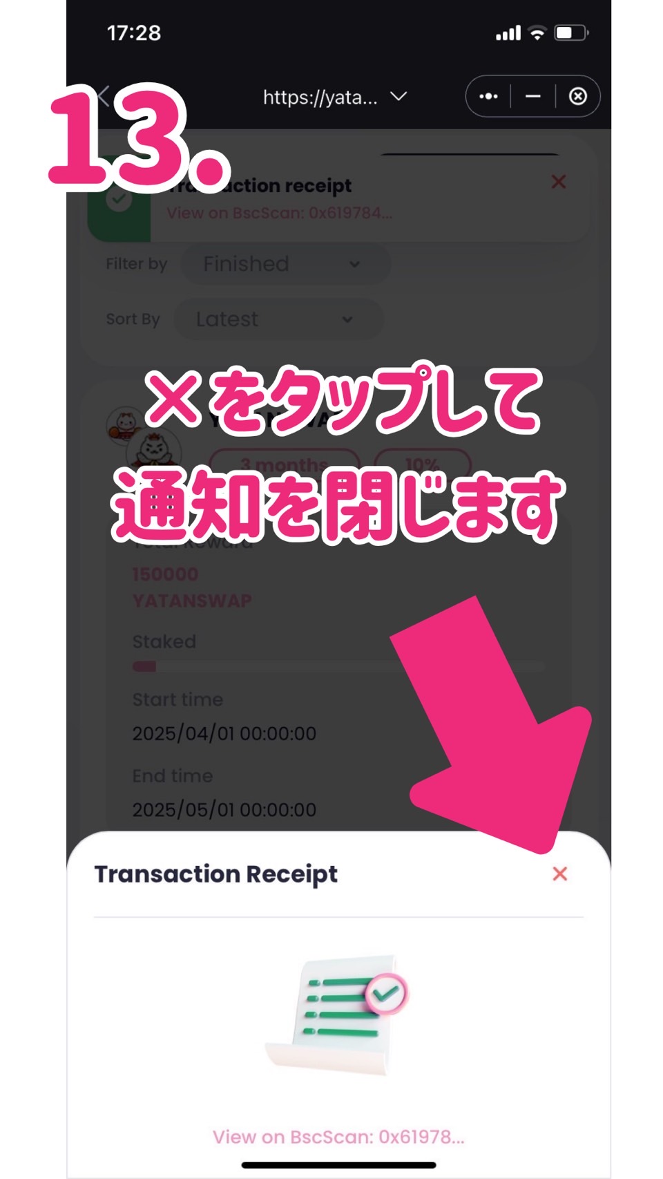 セーフパルウォレットのウォレット画面のYATANPAY(BEP20)をタップしてトランザクションを見てみるとYATAN SWAPがステーキングの報酬として貰えていると思います。
