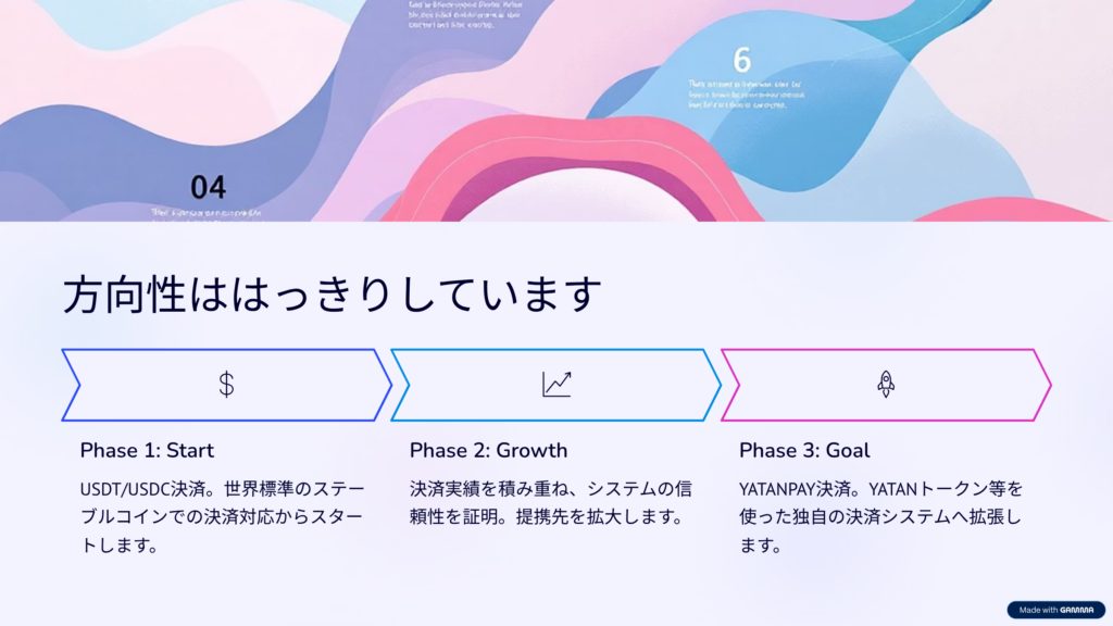 YATANSWAPが目指すのは、「資産を貯めるだけ」ではなく、“使える暗号資産”の世界をつくること。仮想通貨でそのまま支払いができる、そんな未来に一歩ずつ近づく。この計画は、DeFiを“特別な人のもの”ではなく誰でも使える当たり前のサービスにしていくための挑戦です。