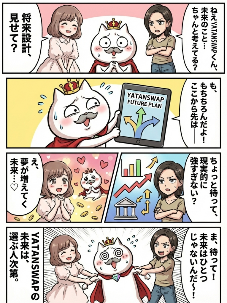 でもそれは「間違い」じゃない。未来はひとつじゃない。だからこそ、選べる。ワクワクも、不安も、どっちも抱えながら進むのがYATANSWAPくん流。