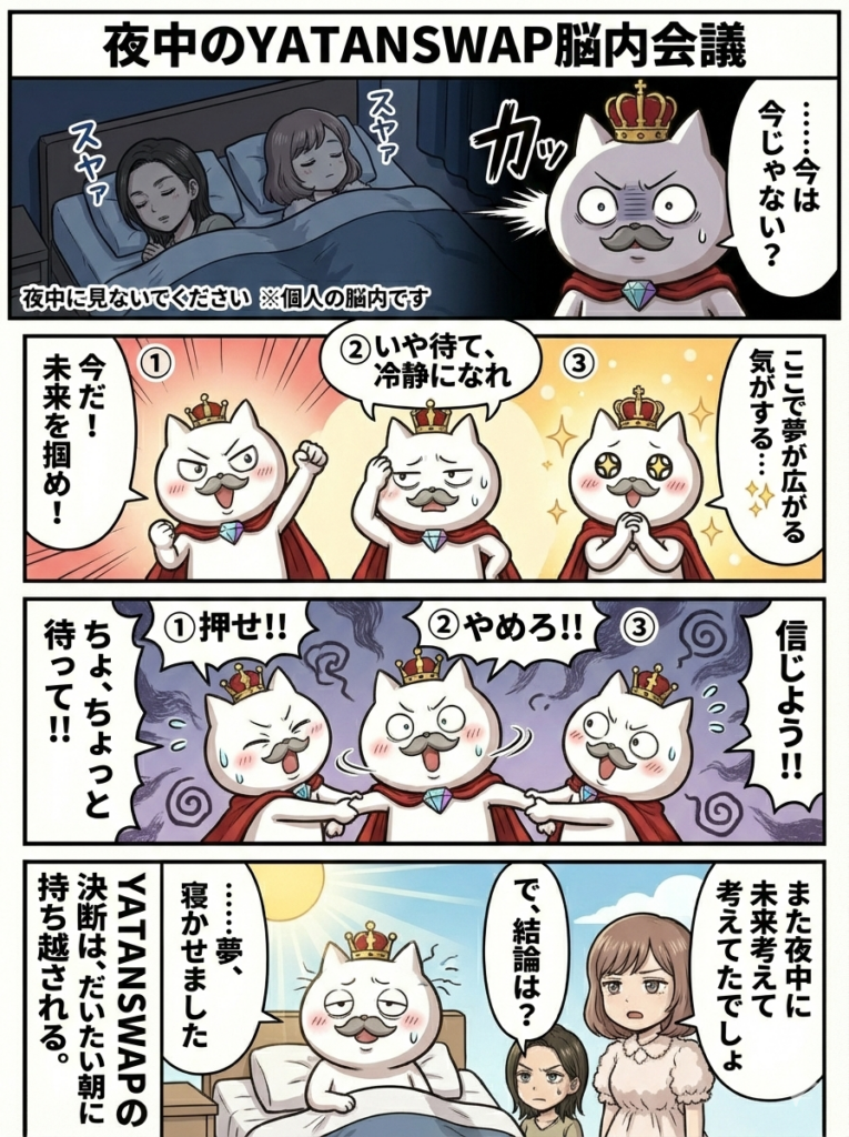そして毎回、結論は出ないまま朝を迎える。だいたいの決断は、だいたい朝に持ち越される。
